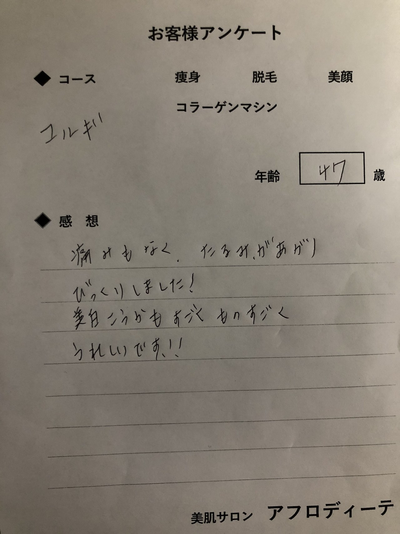 昔、脱毛やったことあったんですが、『何だったんだろう。。。痛かったし…。。。高かった 』という悲しい気持ちに、、、早く出会いたかった!!終わったあとも、痛くない。普通の状態。まだまだ磨くぞ!!先生から元気もらえます!!これからもよろしくです。