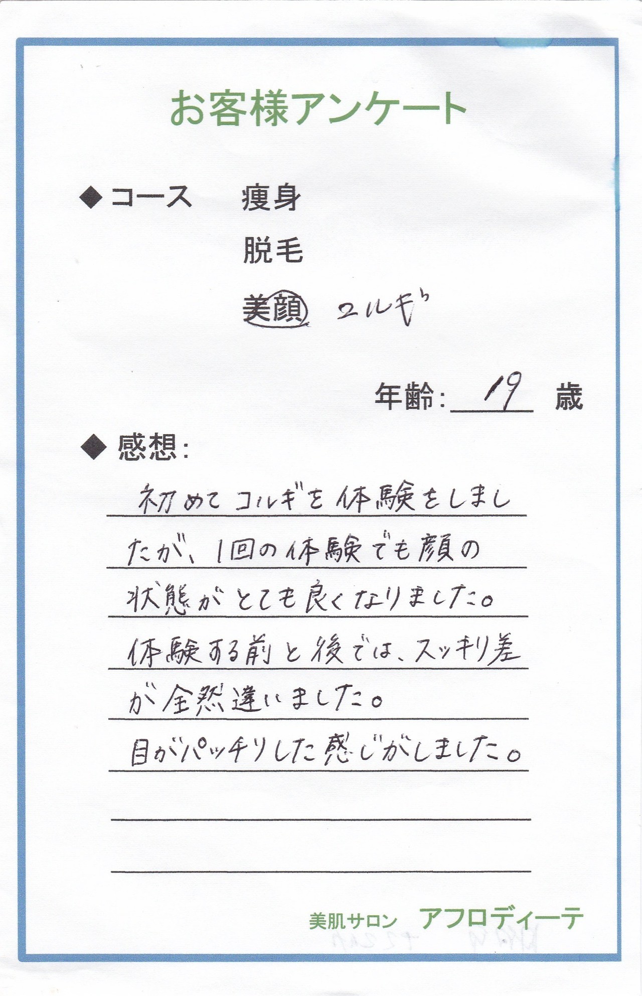 初めてコルギを体験しましたが、1回の体験でも顔の状態がとても良くなりました。体験する前と後では、スッキリ差が全然違いました。