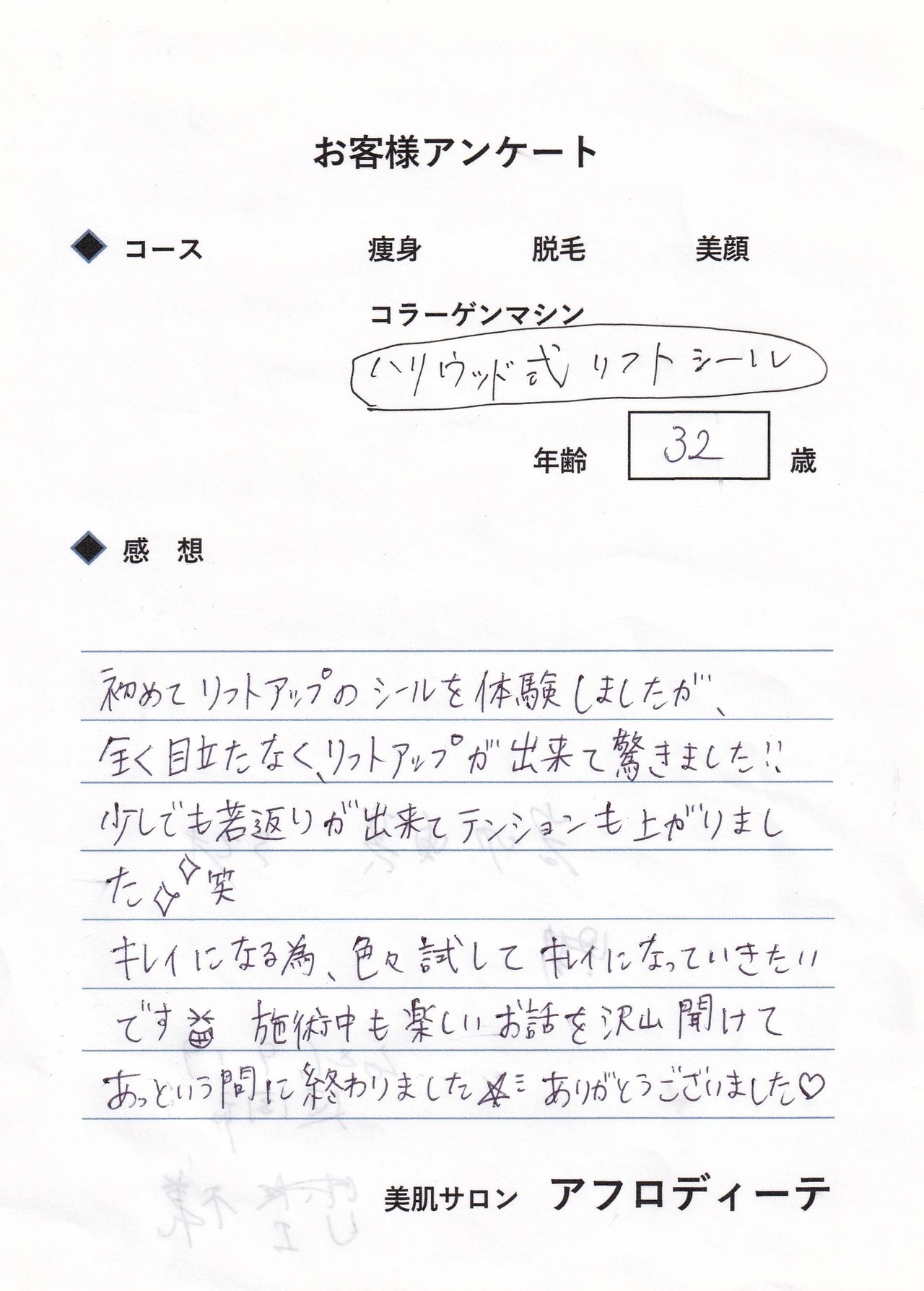 初めてのサロンでしたので、ドキドキしながら伺わせていただいたのですが、楽しいお話もまじえて脱毛してくださり、リラックスしてのぞませていただきました。とても親切にアドバイスも下さり、また通わせていただきたいと思います。ありがとうございました。