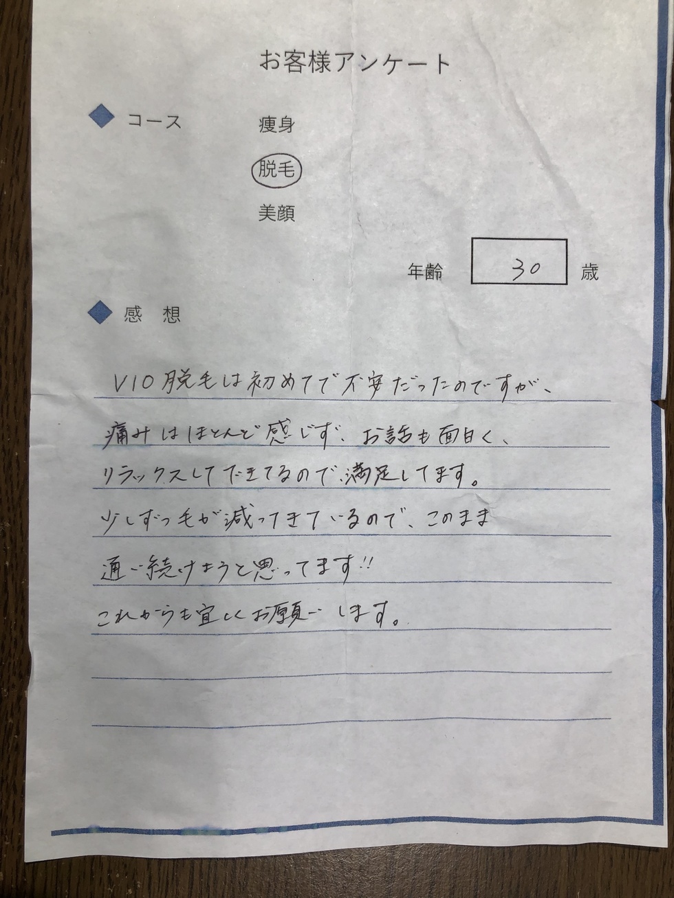 びっくりしたのは、痛みが全くなかった事です。以前通っていたエステサロンではバチバチとゴムではじく痛みがあり、又、6回しても2割程度しか抜けませんでした。しかし、こちらのサロンに通い2、3回でツルツルを実感させてもらってます。大満足です。
