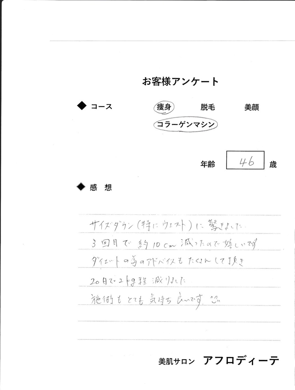 最初痩身でお見えになりました。脱毛は他店にて何年も続けておられましたが完了せず、当店にてSHR式脱毛を受けられました。